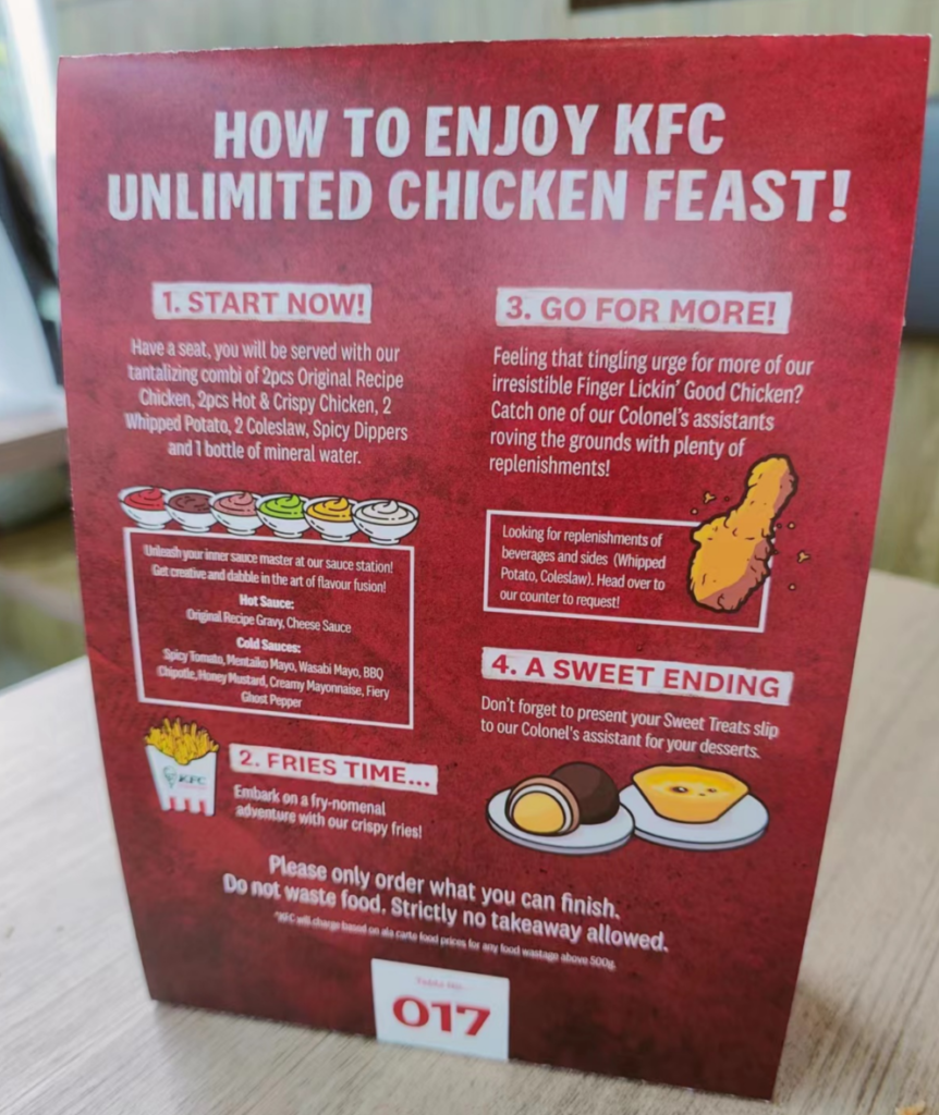 Fast forward to today, KFC Singapore happens to be the first one that offers a buffet style feast. It goes without saying that I waited and pounced for a seat of it when the sales started a few weeks back. But somehow, after that, there hasn’t been much of expectation built up, no sleeplessness the night before, no fasting to make room in my stomach. During the meal, I did enjoy all the chicken the same way I had KFC most of the times, and I was able to stop just before I got uncomfortably stuffed and can’t even look at fried chicken for a month. So everything started and ended very peacefully – no over excitement, no let-down, just OK.